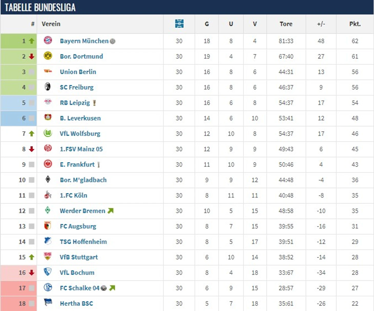 Если после 30-го тура «Бавария» лидировала в таблице, то мюнхенцы также выигрывали титул в 28 из 29 предыдущих случаев (кроме сезона-1992/93);