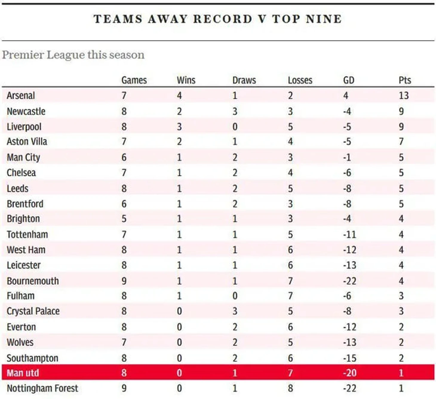 В выездных играх против команд топ-9 таблицы АПЛ «Юнайтед» набрал всего 1 очко − в недавнем матче против «Тоттенхэма» (2:2). Если расширить до топ-10, то количество очков увеличится до 4, благодаря победе над «Фулхэмом» − 2:1.