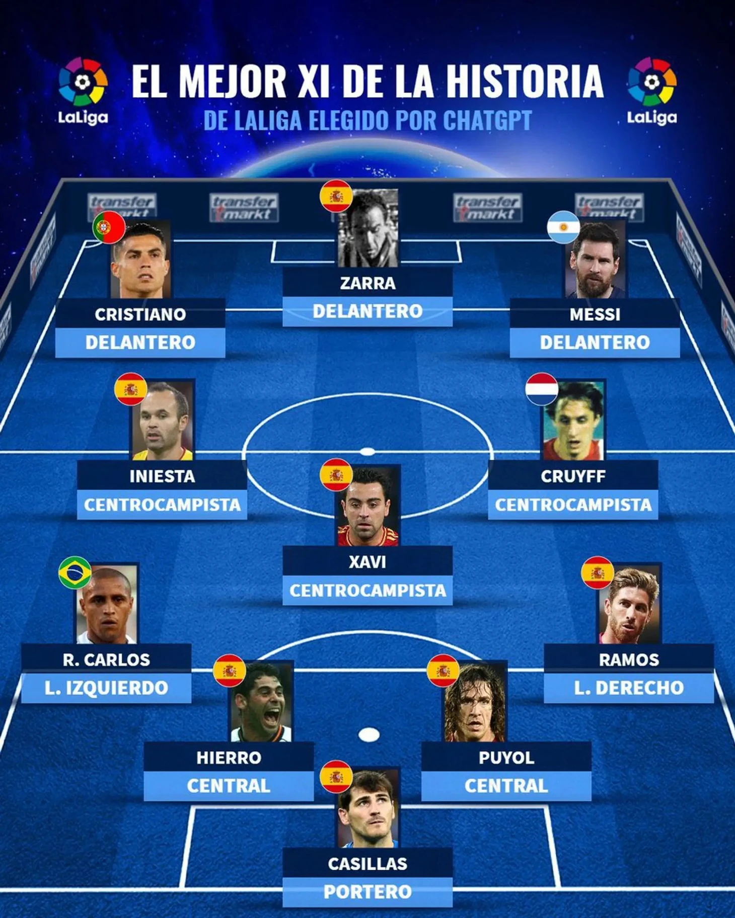 Испанский Transfermarkt попросил нейросеть составить лучшую команду в истории Ла Лиги. Часто результат работы искусственного интеллекта вызывает дискуссию среди фанатов. Но получившийся состав лучших игроков в истории испанского первенства выглядит достойно.