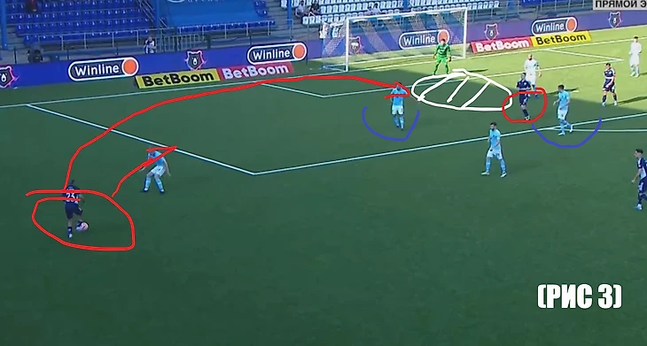 Далее, вроде, не опасный момент навеса заканчивается подбором хозяев и вот тут происходит тактическая ошибка защиты. Лукас Вера мог пытаться пройти на скорости Корнюшина (разрыв был огромен) или отдать пас сразу. Выбрав улучшение позиции, как себе, так и партнерам, Вера сокращает расстояние между собой и защитником. Видя это Масоэро правильно пытается подстраховать Корнюшина, шанс обводки велик. При этом показывает рукой на Оганесяна Михайлову: «Возьми его!». (рис 3). Михайлов видит и указание от Масоэро, оборачивается посмотреть, где Оганесян, но… не идет за ним в свободную зону! Слишком молодой игрок «Пари НН» верил в Корнюшина, что тот не даст возможности Вере навесить! Или просто досматривал эпизод. Это тоже с ним иногда бывает