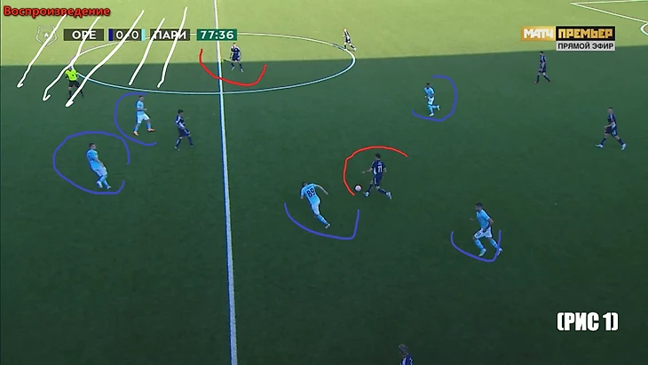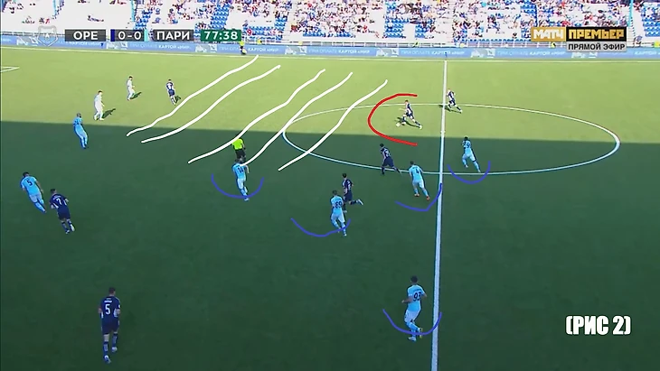 Атака хозяев начинается со своей половины. Мы видим (рис 1), как игроки гостей большими силами придавливают, прессингуют. Но при этом остается свободным противоположный фланг, кода и смог отдать защитник (рис 2), перед которым образовалась очень большая свободная зона. Именно эта идея с пресыщением в краях от Юрана и дала результат в матче, как положительный (много успешных своих атак, в том числе и отмененный гол), так и отрицательный. Только ближе к концу матча «Оренбург» смог воспользоваться этой уязвимостью «Пари НН». И то атака почти захлебнулась. Юлдошев хорошо отзащищался и выбил мяч в аут.