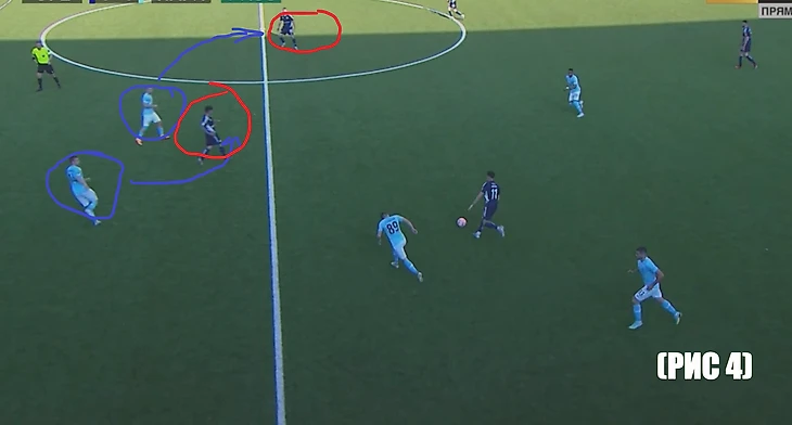 .Как бы то ни было, Оганесян забивает в красивом кульбите. Нижегородцы остаются без очков в ничейном матче. Да, произошла индивидуальная ошибка, но если бы в начале атаки Жигулев не стал делать насыщение фланга, а остался по дальнему игроку (рис 4), и Михайлов бы (снова он), пошел не пробовать закрыть зону, а к 21-му номеру, то скорее всего атака захлебнулась бы, не начавшись. Но тут игроки действовали в рамках тренерских установок на матч. И всю игру защита справлялась с трудностями при таких перемещениях обороны.