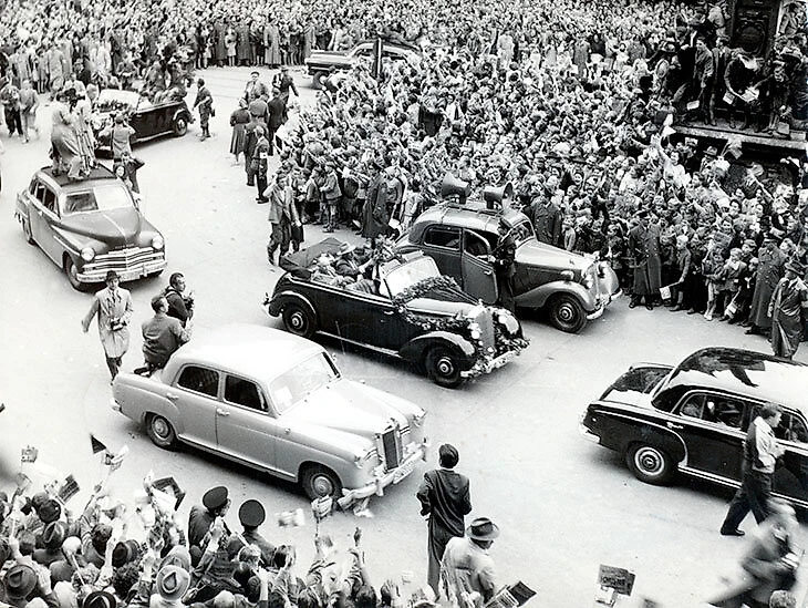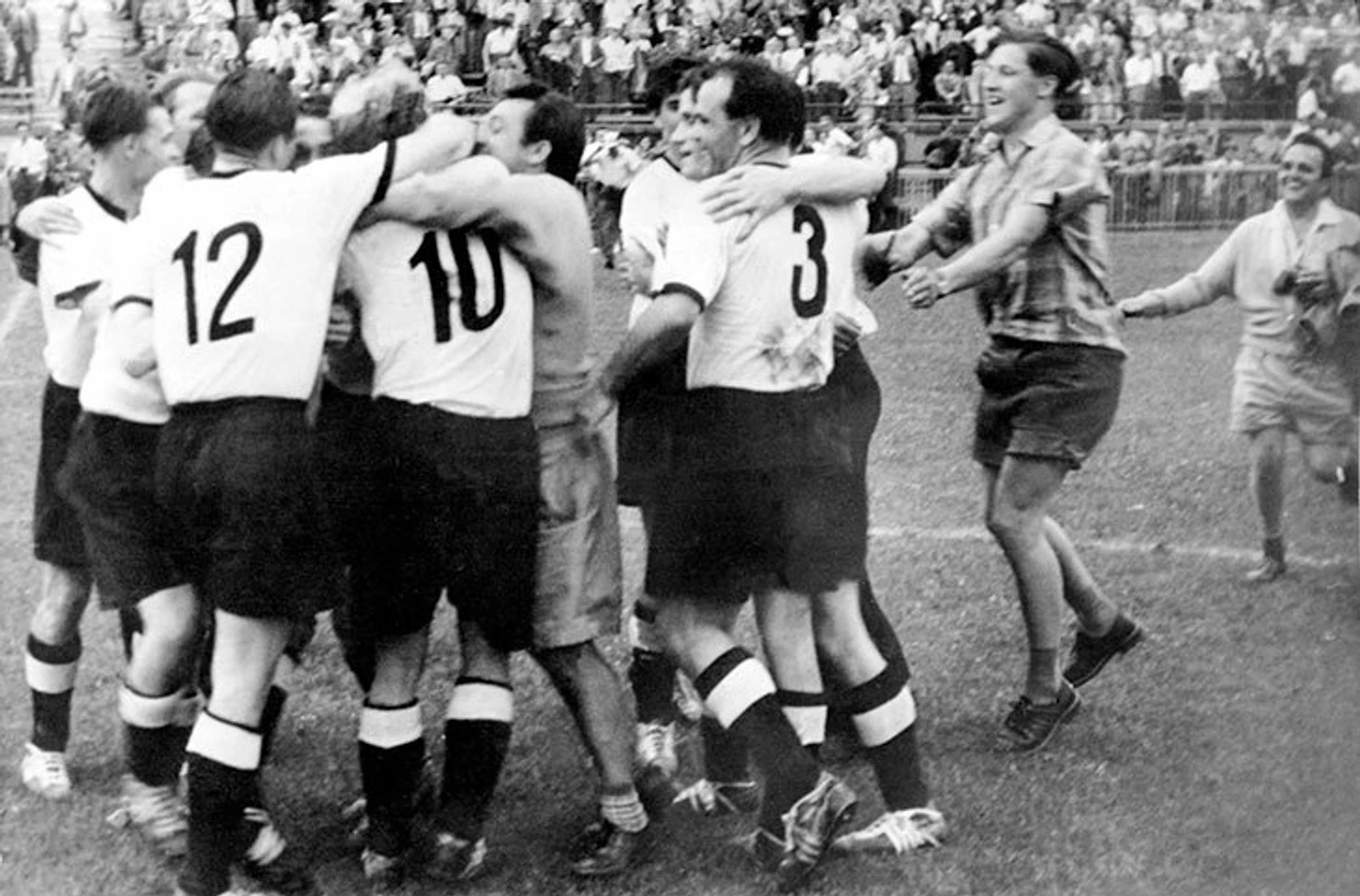 В современных реалиях сложно себе представить, что творилось в ФРГ после победы национальной сборной в финале ЧМ-1954. Deutsche Bundesbahn (управление немецких железных дорог) предоставило футболистам специальный поезд, отправившийся из швейцарского Шпица в Германию под нескончаемый аккомпанемент всевозможных празднований. Der «Weltmeisterzug» («поезд чемпионата мира») встречали тысячи немцев, в крупных городах ФРГ устраивали настоящие празднества, а на площади Мариенплац в Мюнхене, куда игроков привезли на двенадцати кабриолетах Merсedes, собрались больше ста тысяч человек. Историк Альфред Георг Фрай описывал подобные встречи так: «Неистовые аплодисменты, сломанные полицейские заграждения, бесконечные подарки игрокам, духовая музыка и речи мэров, которые никто не хотел слушать». Через две недели после финала сборная оказалась в Берлине, где на «Олимпиаштадион» ее приветствовали 80 тысяч человек во главе с президентом страны Теодором Хойсом, а на следующий день в столице ФРГ Бонне министр внутренних дел Герхард Шредер вручил футболистам «Серебряный лавровый лист», главную спортивную награду республики. Немецкие газеты буквально захлебывались в пафосе: «Die Welt» назвала триумф Германии «беспрецедентным», а «Spiegel» вызвала настоящий скандал сравнением атмосферы радости, царившей в ФРГ, с тем, что происходило в стране во время Олимпиады-1936 в Берлине. Европейские СМИ были более сдержанными, но и они не избежали довольно острых метафор, от «Блицкрига» у англичан до «тевтонской мощи» у итальянцев.