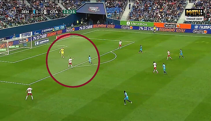 На 13-й минуте он контролировал мяч в штрафной после паса от центрального защитника и должен был выбивать его (или пасовать на фланг, вариант был).