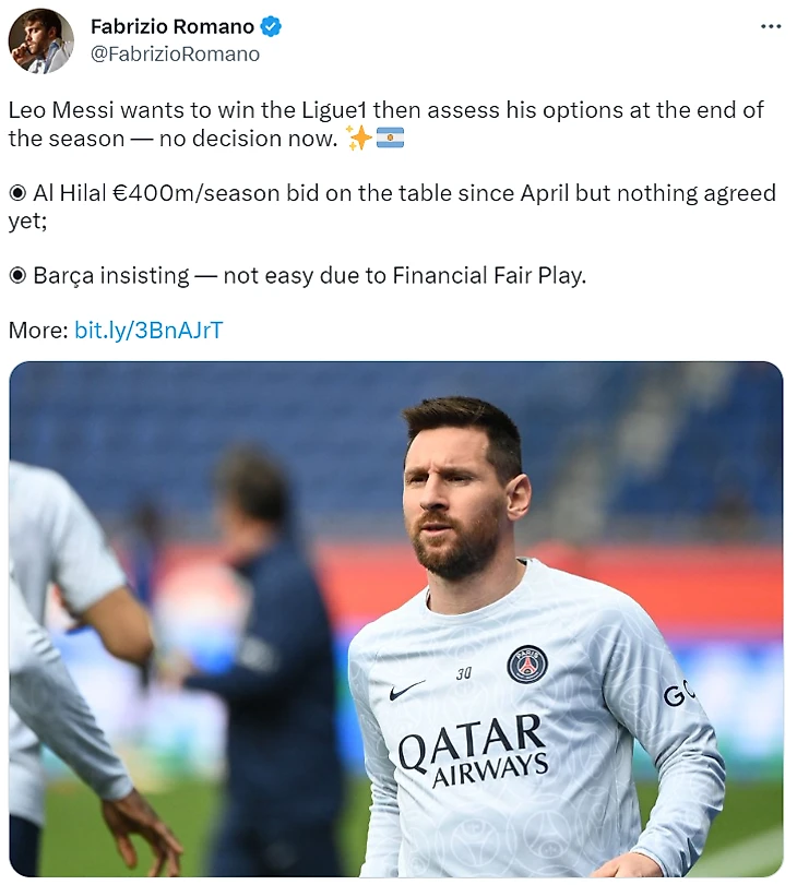 Предложение от «Аль-Хилаля» в размере 400 млн евро за сезон поступило к Месси еще в апреле, но пока у клуба и игрока нет никаких договоренностей.