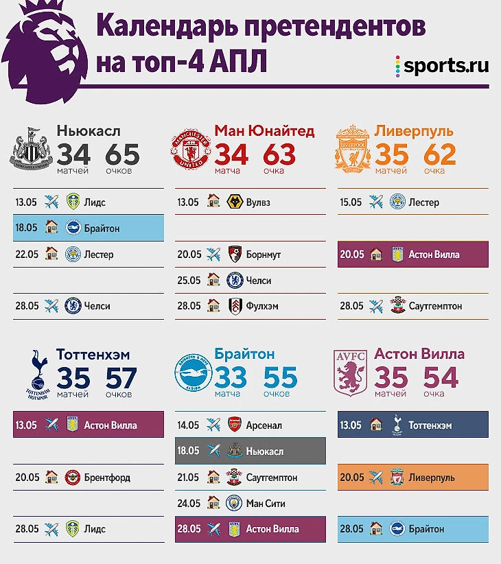 Гонка за топ-4 в АПЛ в самом разгаре: два места забронировали «Манчестер Сити» и «Арсенал», за оставшиеся сражаются сразу шесть клубов – «Ньюкасл», «Манчестер Юнайтед», «Ливерпуль», «Тоттенхэм», «Астон Вилла» и «Брайтон».