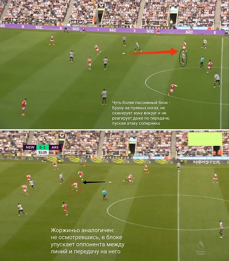 Возвращаясь к недавно затронутой области. Проблемы сегодняшних топ-опорников с контролем своего ареала при средне-низком блоке, в реагирующей обороне – не отдельный казус «Челси», ярче остальных её подсвечивающего неподходящим игрокам стилем. Буквально вчера во встрече двух вновь английских, однако пышущих здоровьем команд, «Арсенала» и «Ньюкасла», каждая из них неоднократно пускала соперника к воротам в стиле синих лондонцев. Оказываясь в относительно пассивном построении, их осевые хавбеки тонули в пространстве вокруг себя, теряя и соперников, и передачи на них.