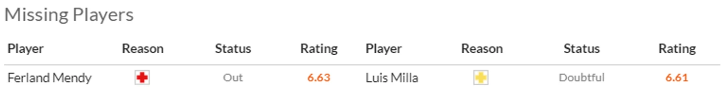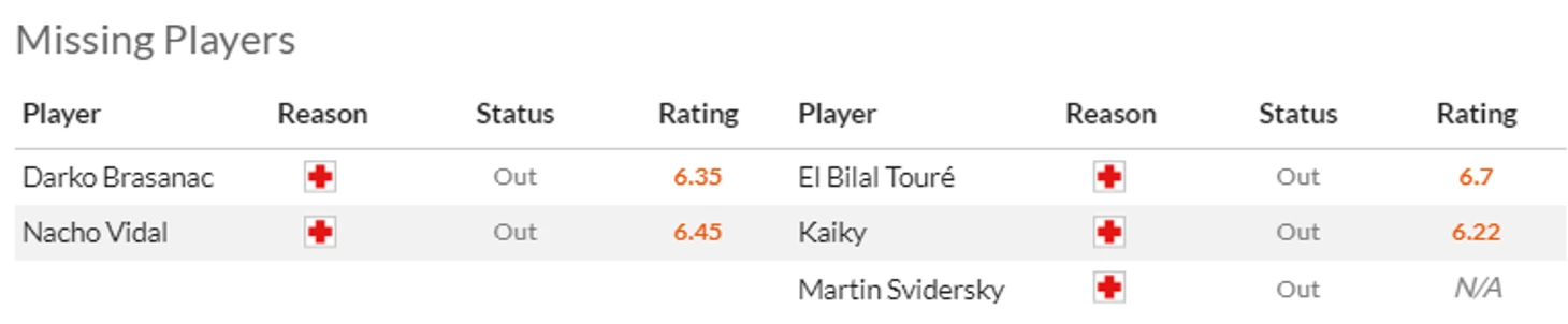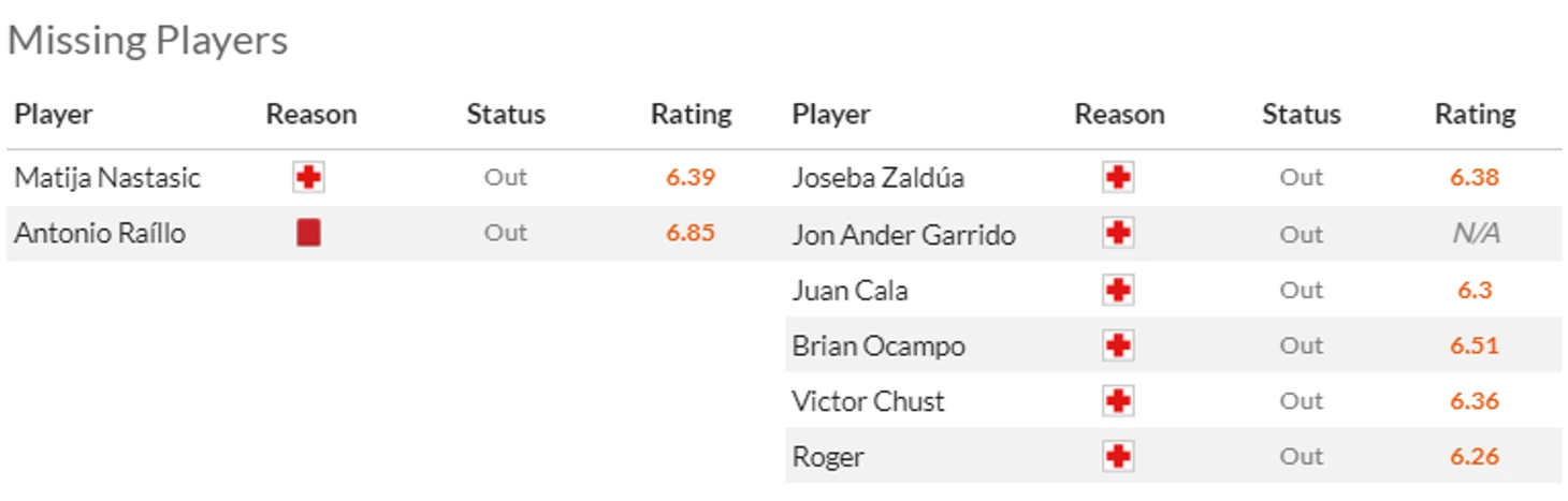 А вот хозяева без всяких еврокубков не выставят на поле Аммала(7), Луиса Переса(5) и возможно восстанавливающего от повреждения Дарвина Мачиса(7).