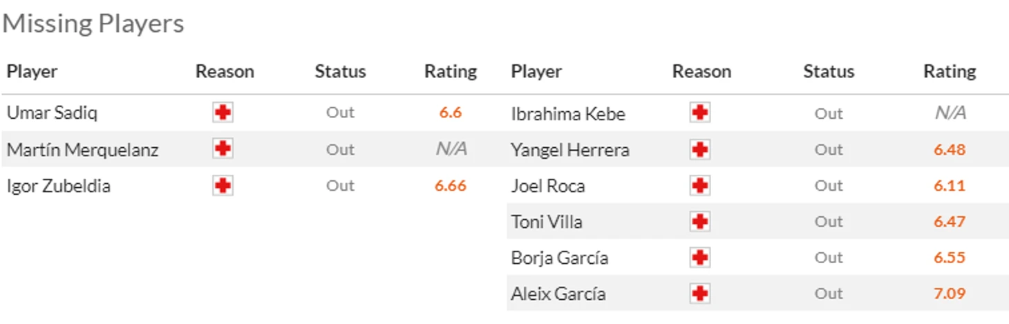 Что касается хозяев, то в субботу они не смогут рассчитывать на Браиса Мендеса(8). Полузащитник повредил приводящую мышцу и точно не поможет команде в игре с каталонцами, зато сегодня в общую группу вернулся Игор Субельдия(5,5).