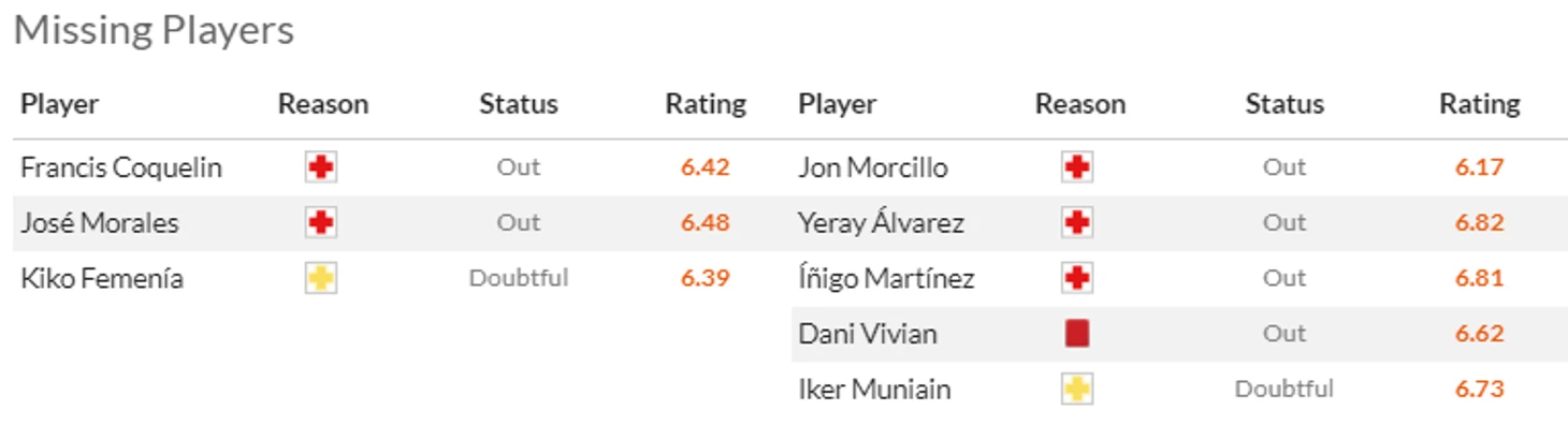 Атлетик бы наверняка тоже хотел бы укрепить свою прореженную травмами и дисквалификациями линию обороны, но баски сильно ограничены своим внутренним трансферным императивом и чистотой рядов. Поэтому особенно тревожно выглядит новость о повреждении Оскара Де Маркоса(5,5) из-зи которого он может пропустить субботний матч. А хозяевам не помогут засевшие в лазарете Альбиоль(5,5) и Фемения(5,5).