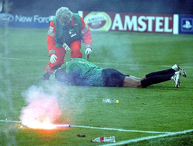 На трибунах начался ад, на поле полетели еще и еще файеры.