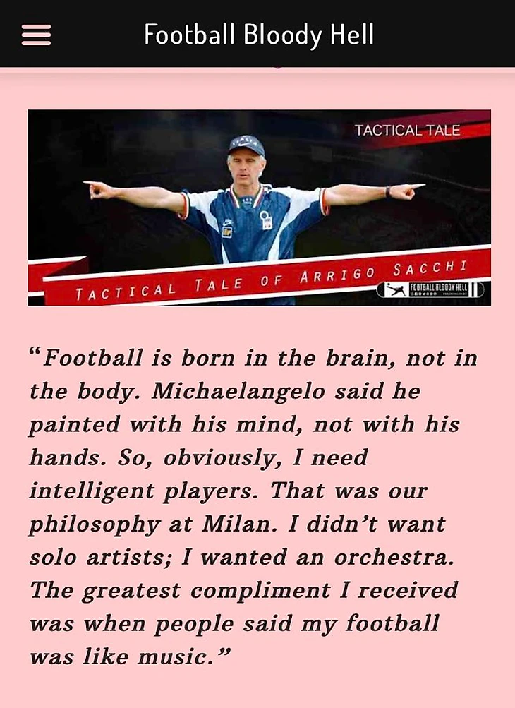 Арриго Сакки по-прежнему является одним из главных приверженцев позиционной игры (вместе с Ринусом Михелсом и Пепом Гвардиолой). Сакки говорил, что "футбол рождается в мозгу". Что ты думаешь о футболе Сакки?