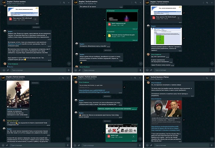 Для постоянной связи с каждым из игроков, мы также используем чаты в ватсап, где игрок отписывается по своему самочувствию после выполненных тренировок и делится другой информацией, получает различную обучающую информацию, а в случае с Богданом мы ведем контроль исполнения дополнительных тренировок. Игрок записывает выполнение упражнений на технику и по физической подготовке, а наша команда корректирует игрока при необходимости.