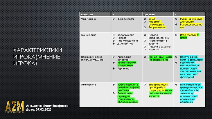 2. Объявление субординации: мы всегда говорим, что самое важное мнение для игрока - это мнение главного тренера команды и его штаба. Мы лишь работаем над тем, чтобы игрок глубже анализировал свою игру, осознавал свои действия и тем самым эффективнее исполнял свою роль на поле. Никаких конфликтов интересов с действующим тренерским штабом игрока у нас быть не должно. Если возникают какие-то вопросы к нашей работе, мы всегда готовы к диалогу. Ведь цель у нас одна: раскрытие потенциала игрока.