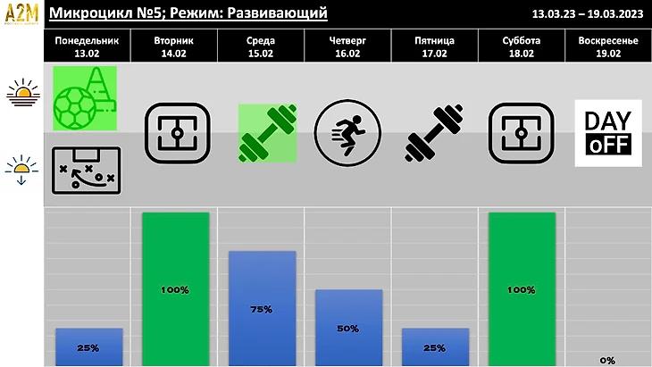Определив вектор развития, мы начинаем встраивать наши тактические сессии и дополнительные занятия в тренировочный микроцикл игрока и команды.