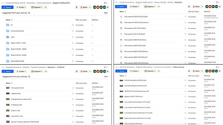 Игроки получают доступ к облачному хранилищу, где у них есть папки с видео анализом по прошедшим матчам, обучающие видеоролики по позиции, план-конспекты подготовленных тренировок и другая полезная информация. Для постоянного общения и контроля создается чат в ватсап, где мы держим постоянную связь и получаем информацию о состоянии игрока и его ощущениях, там же мы обмениваемся информацией и получаем видеозаписи тренировок игроков, чтобы вносить корректировки. Мы используем крупнейших статистических провайдеров для анализа игроков на профессиональном уровне, а также видео аналитические программы для кодинга игры и использования графики. Обо всем по порядку.