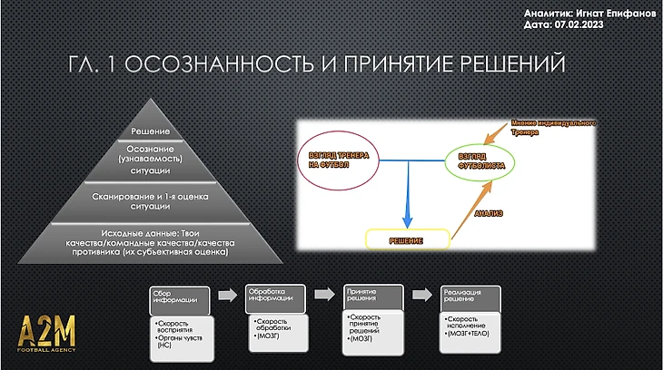 3. Комплексный подход. Если описать кратко, индивидуальный тренер-аналитик помогает улучшить качество принятий решений на поле. Не вдаваясь сильно в нейробиологию, схема принятия решений и его исполнения выглядит следующим образом.