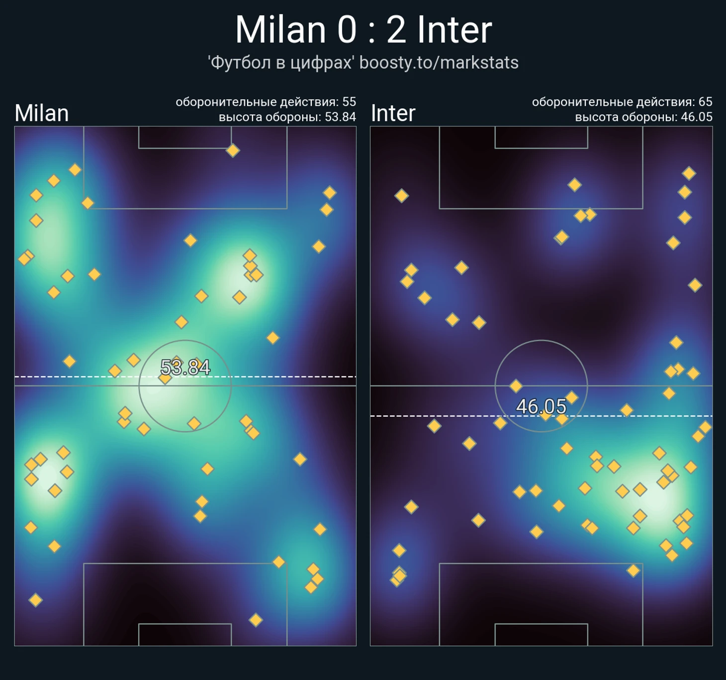 Со временем «Интер» закономерно стал понижать линию обороны, понимая, что владение во второй трети, а тем паче в финальной им больше не светит. Итоговый показатель высоты обороны – чуть более 46. Иными словами, в среднем подопечные Индзаги встречали оппонентов всё-таки выше радиуса центрального круга. Не последнюю роль в этом сыграли латерали, которые, как я ранее и говорил, действовали заметно уже обычного.