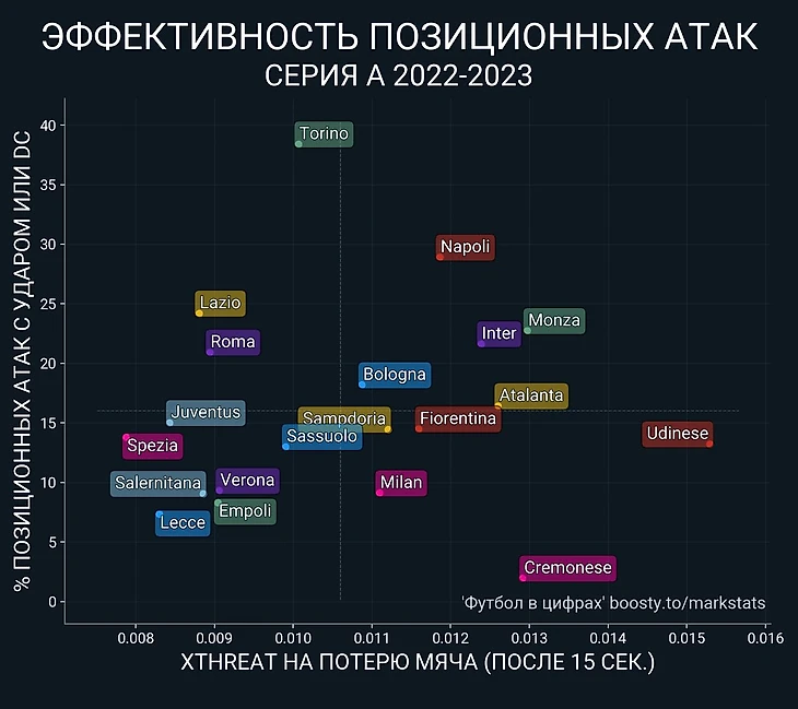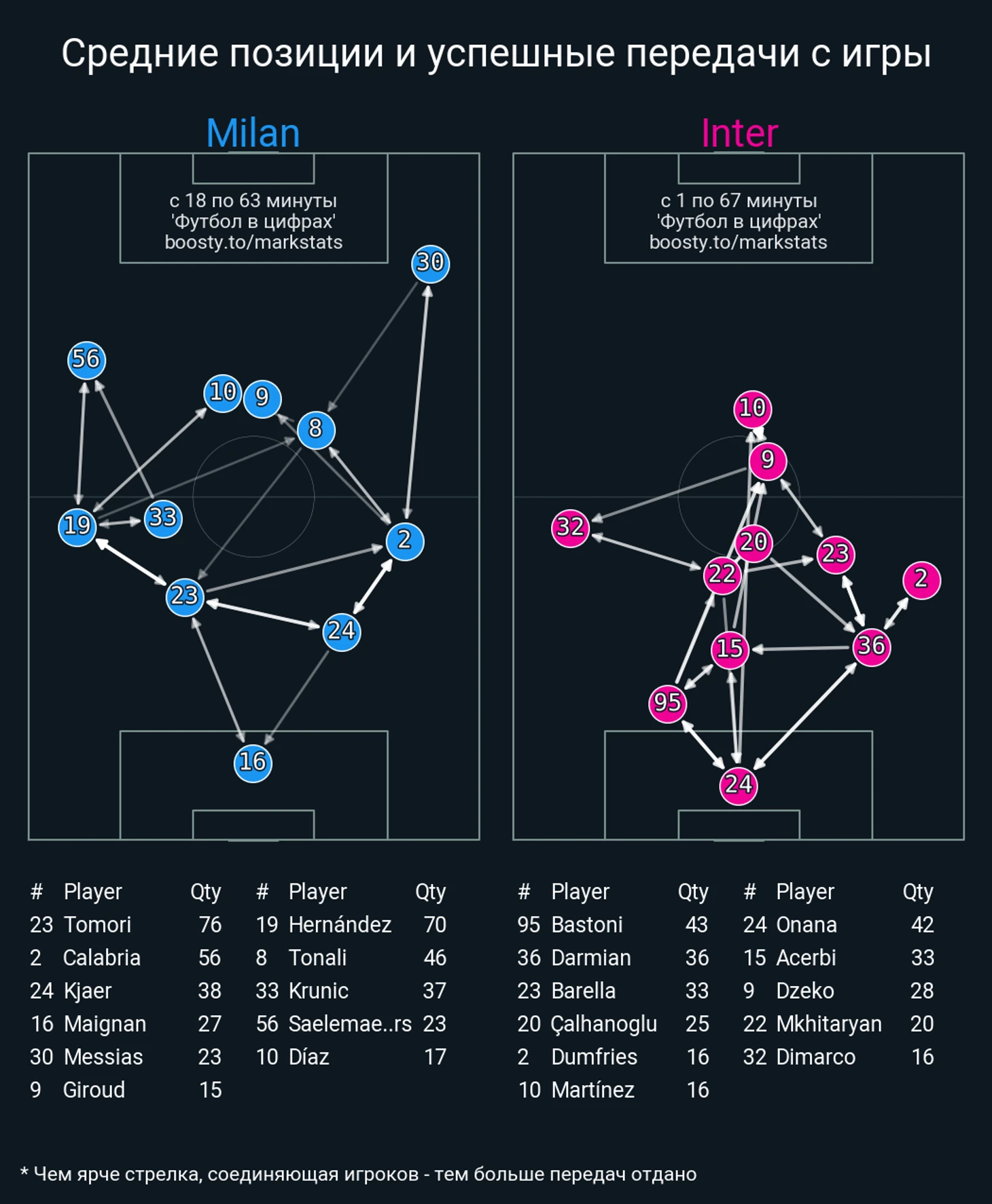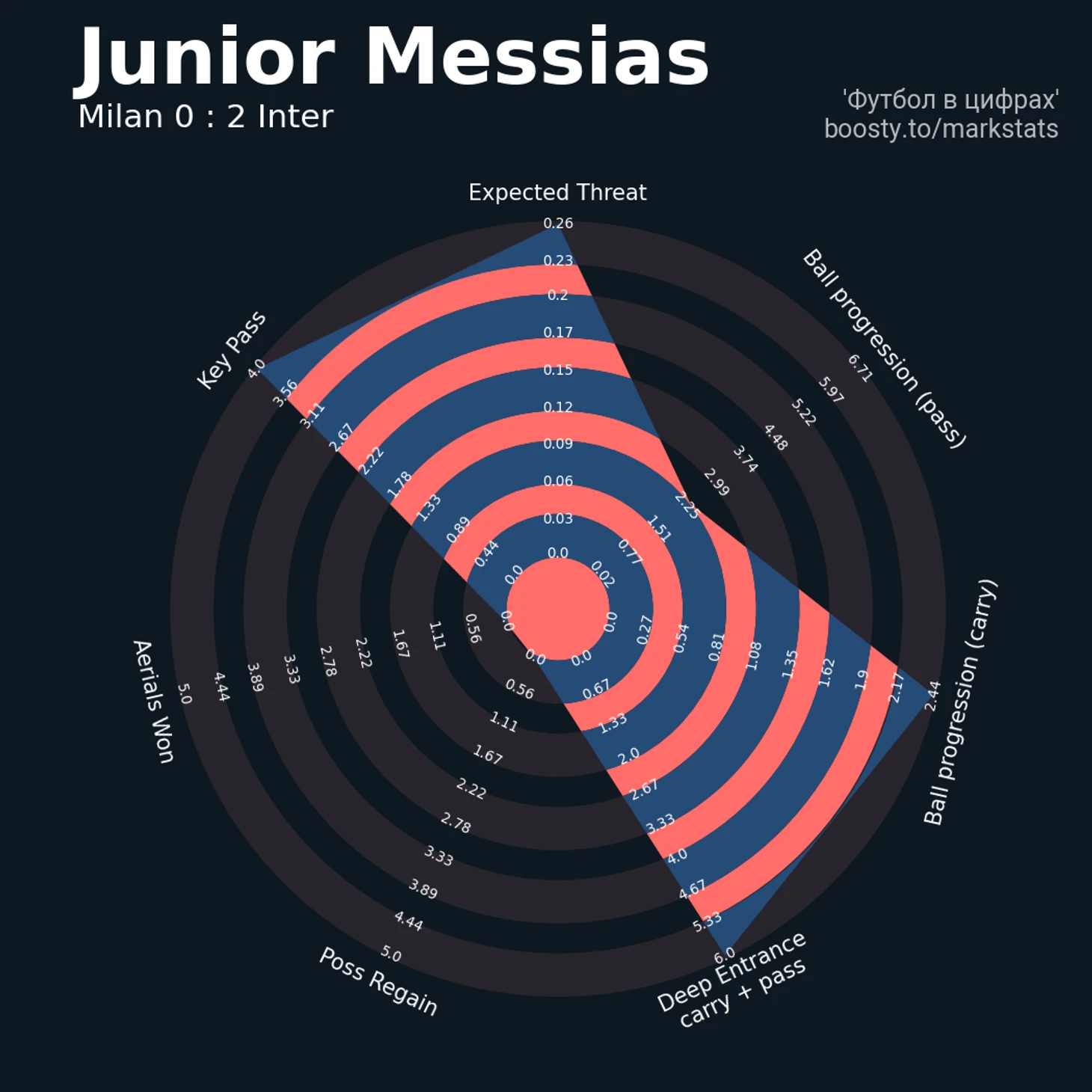 То, что «Милану» придётся туго без Леау, было понятно до игры. Вопрос заключался в выбираемой Пиоли формацией в отсутствие португальца. Билд-ап сохранился прежним, по крайней мере относительно того, с которым «россонери» играют в чемпионате последние полтора месяца. Что касается типа футбола, он преимущественно оказался комбинированным: позиционки перемежались контратаками. Причина такого подхода, как кажется, банальна. Диас хорош при резких выпадах, а его взрывная скорость делает из него оптимального фол-таргета для оппонента (Бастони не даст соврать). Кроме того, в первые полчаса гости основательно засели на чужой половине, поэтому уповать на построение атаки с множеством коротких и средних пасов было неуместно. Должных драйверов для позиционки не нашлось, разве что Жуниор Мессиас во втором тайме с его приличными показателями Key Pass и Deep Entrance.