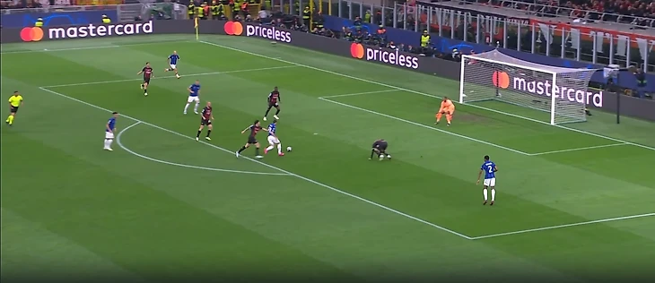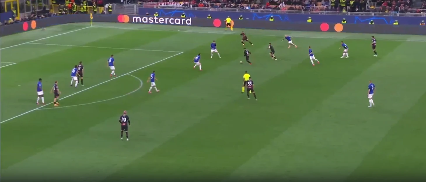 «Нерадзурри» прекрасно освоились у чужой штрафной, однако при любом атакующем выпаде парней Пиоли мгновенно вовзращались в первую треть. Самый наглядный кейс – эпизод с пяткой Калабрии. Идёт предпоследняя фаза атаки. Обратите внимание: все «чёрно-синие» находятся на своей половине, более того – все, за исключением Джеко, уже в пределах первой трети поля, а Жиру, как потенциально самого опасного игрока, опекают аж трое.