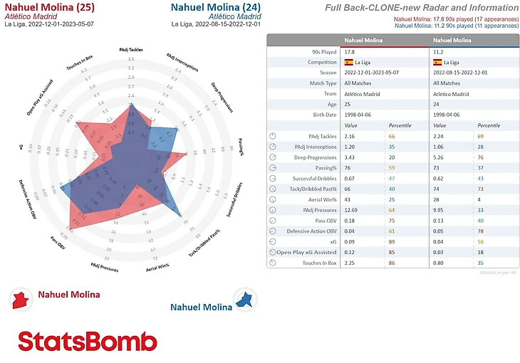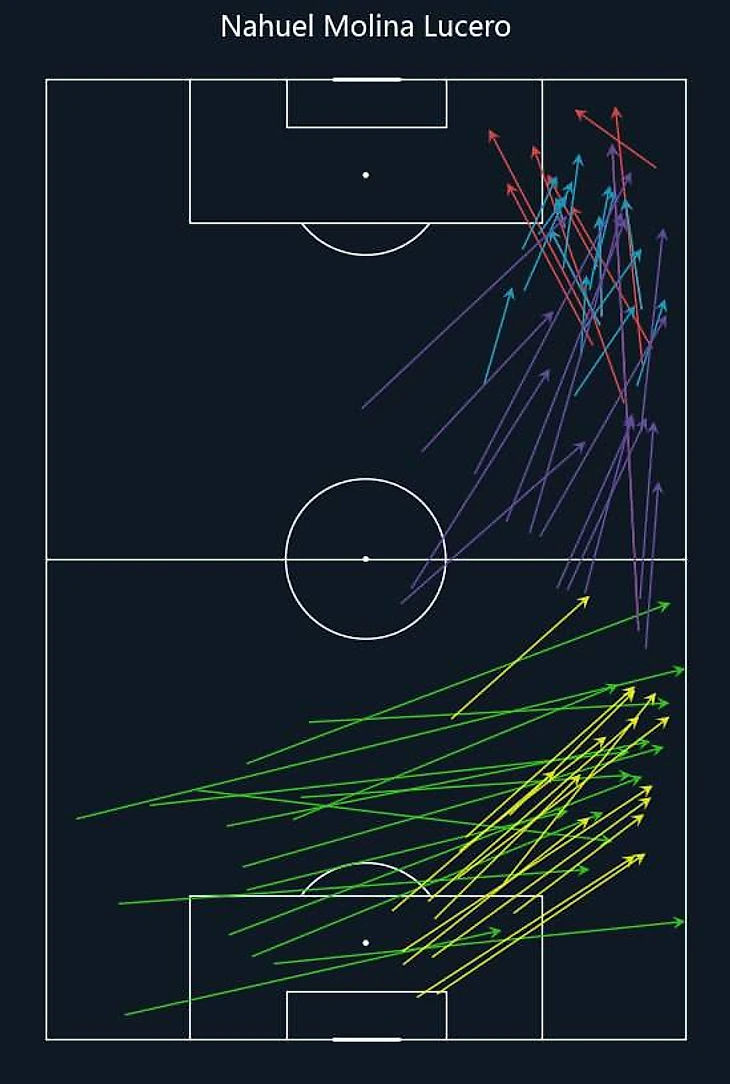 Разумеется, Молина сильно прибавил после ЧМ, как и вся команда. На радарах (фото 1) видно сравнение Молины ДО и ПОСЛЕ мундиаля. Выросли в первую очередь атакующие показатели (особенно ярко в xG, xA и касания в штрафной) в том числе по пасовым метрикам, прессинг-действия, но при этом не появилось проседания в обороне. Молине удалось прибавить во всём.