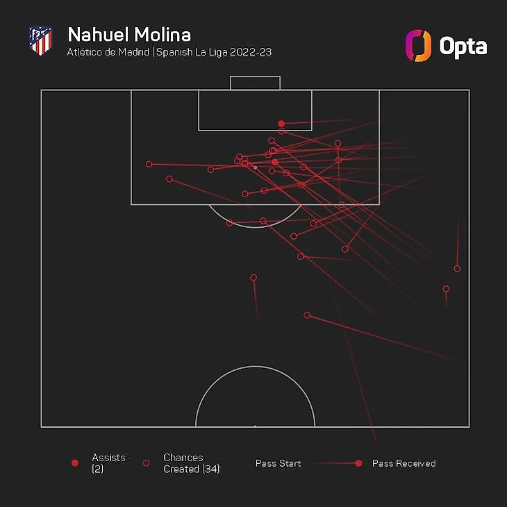 Абсолютные значения тоже показывают прогресс — у Молины три гола и два ассиста, и все после ЧМ. Он третий защитник Лиги по созданным шансам (на фото 3 все шансы, созданные Молиной) и, кстати, карта этих созданных моментов отлично иллюстрирует то, насколько разнообразно умеет угрожать Молина — и скатить в центр, и подать/прострелить, и отдать в штрафную из полуфланга. В атаке, откровенно говоря, у Молины крайне мало слабых мест.