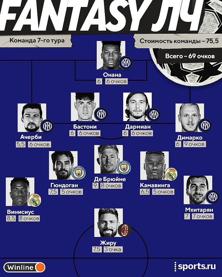 Наверняка вы удивились: в нападении нет Эдина Джеко (забил и набрал 6 очков), там Оливье Жиру (3 очка). Дело в том, сухая победа «Интера» позволяет набрать много очков за счет защитников, поэтому при лимите в шесть игроков из одного клуба выгоднее было взять вратаря, четверых защитников и Генриха Мхитаряна.