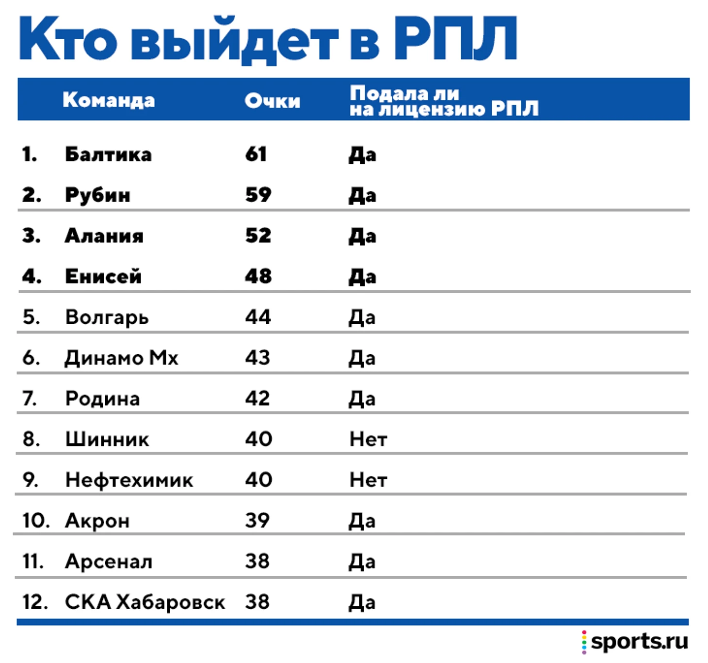 Все вышеупомянутые команды уже подали документы на лицензирование для РПЛ. К нему также готовы «Акрон» (39 очков), «Арсенал» и СКА Хабаровск (по 38 очков), которые сохраняют теоретические шансы на четверку или пятерку. А вот «Шинник», «Нефтехимик» и КАМАЗ, которые тоже в группе преследователей, на РПЛ документально не претендуют.