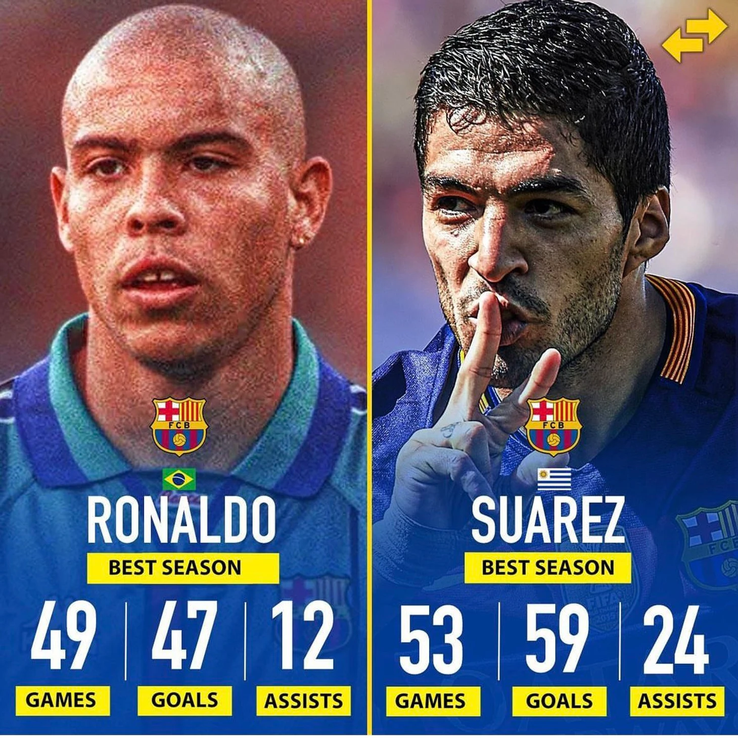 Первое, что нужно понимать. Что эти цифры за Барсу Роналдо выдал когда ему было - 20 лет. Суарес в Барсу приехал будучи уже супер звездой, на своем пике. А в 20 лет Суарес, 10 голов за Гронинген забивал.