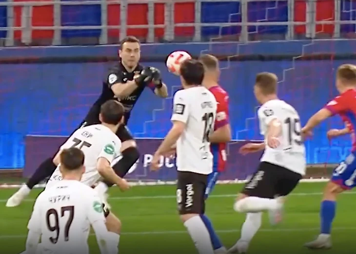 Про игру вратаря кулаками. На мой взгляд, кулаками (одним или двумя) вратарь должен играть только при игре «на выходах» при навесах-прострелах. Отбивать мяч, который идет в ворота лучше рёбрами ладоней (если позволяет момент и мяч идет недалеко от вратаря). Игра кулаками требует максимальной точности. Малейший просчет и мяч скользнет по кулакам и залетит в ворота. Как пример: Вот Акинфеев уверенно отбивает кулаками удар со штрафонго