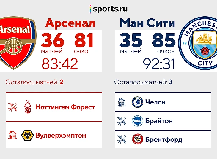 У «Арсенала» осталось два матча: против «Ноттингема» в гостях и «Вулверхэмптона» дома. Не самые сложные соперники, но даже двух побед лондонцам, вероятно, не хватит для чемпионства. У «Сити» четыре очка преимущества и матч в запасе.