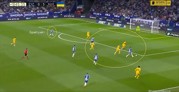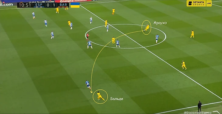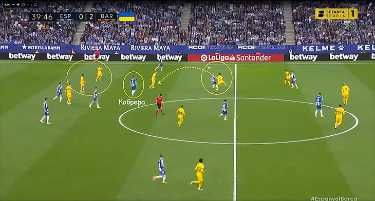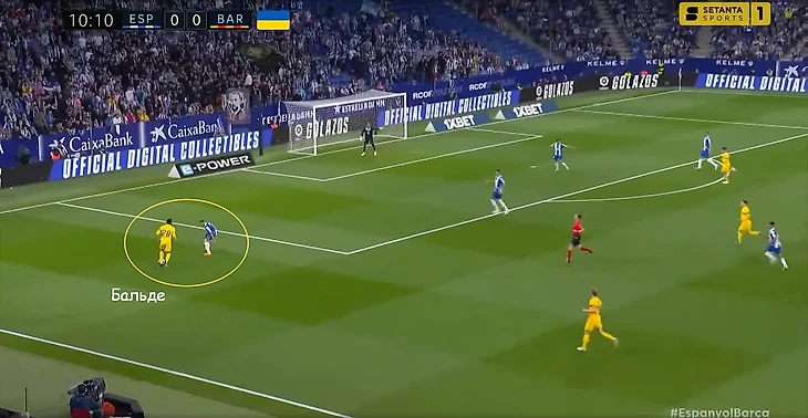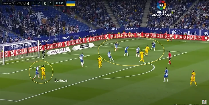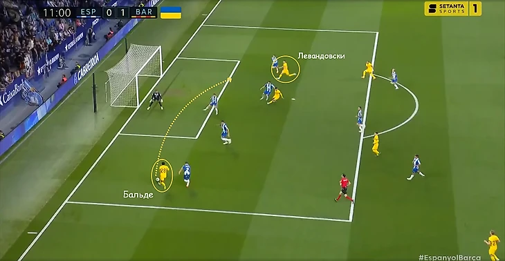 1-й гол. Линия обороны «Эспаньола» поднялась, но команда не прессингует до упора. Араухо получает открытый мяч и без сопротивления выдаёт диагональ на Бальде. Алекс получает ситуацию 1 в 1, обыгрывает защитника, а затем простреливает на Левандовски, который, сыграв на опережение, отправляет мяч в пустые ворота.