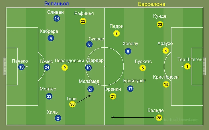 У команды Хави все игроки были доступны, поэтому на поле появилось уже привычное сочетание футболистов. Бальде слева, четвёрка полузащитников в центре поля и Рафинья на правом фланге.