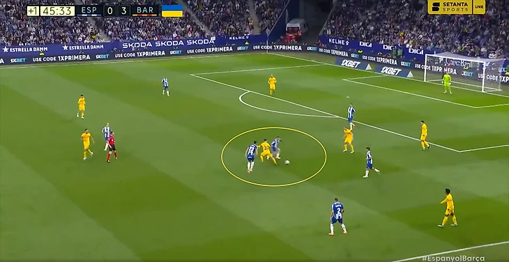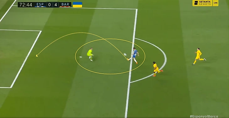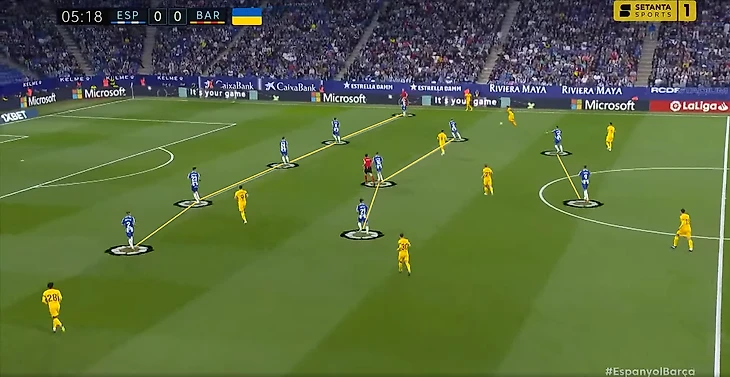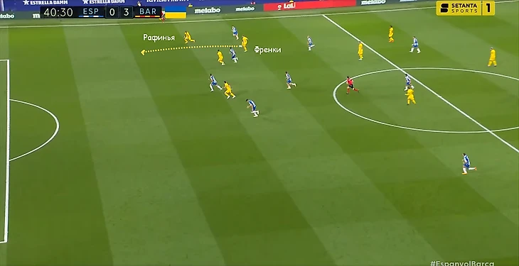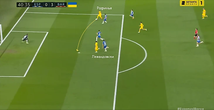 3-й гол. «Эспаньол» отбирает мяч и пытается начать собственную атаку, но под давлением теряет владение. Несколько игроков оказываются в полупозициях, что позволяет Де Йонгу сделать передачу в свободное пространство на Рафинью. Дальше идёт прострел от бразильца. И очередной гол Левандовски.