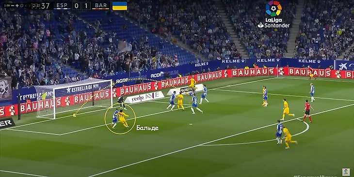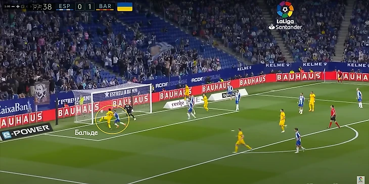 2-й гол. Педри стягивает большую группу футболистов «Эспаньола» на один край штрафной, а на другом - Бальде снова остаётся 1 в 1. Туда идёт подача. Алекс завершает на дальней штанге.