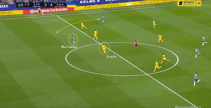 В дерби были как удачные, так и неудачный примеры данного приёма. Например, здесь Альба вовремя сделал движение вправо и затормозил. Нико Меламед попал в положение вне игры.