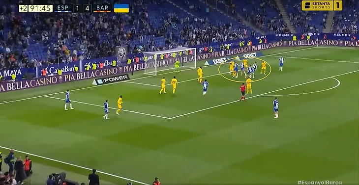 А сам удар случился после того, как большую группу игроков «Эспаньола» оставили свободной перед воротами. Численно в зоне равенство (4 в 4), но ни один игрок хозяев не закрыт.
