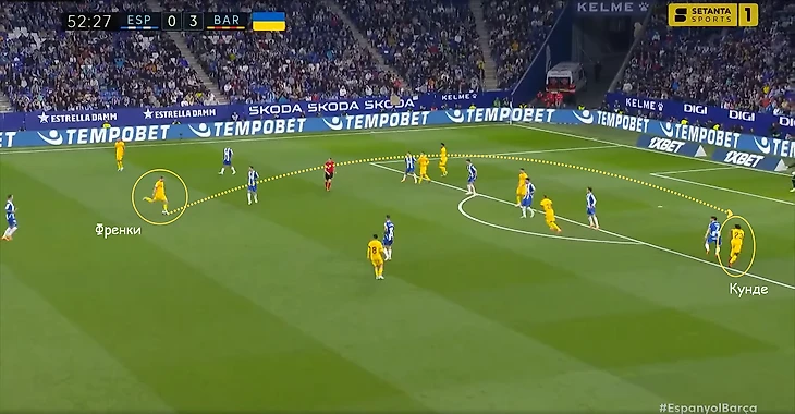 4-ё гол. Отличный черпачок от Френки. В этом сезоне мы уже неоднократно наблюдали, как Де Йонг или Бускетс выполняют передачи подобного типа. Обычно адресатом становился Рафинья, но в данном эпизоде завершал Кунде.