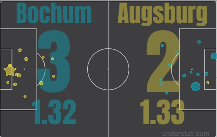 Тренд 32-го тура на успешную игру домашних команд не мог не поддержать «Бохум». В родных стенах он набрал значительно больше, чем на выезде — 20 очков против 8 перед туром. Однако 7-я домашняя победа в сезоне стала едва ли не самой важной. Она позволила «Бохуму» покинуть зону вылета. Голы посыпались довольно рано. Уже на 2-й минуте провал на правом фланге обороны «Аугсбурга» привёл к свободному получению мяча Кристофером Антви-Аджеем. Ганец мощно пробил из не самой выгодной позиции, сильно над руками вратаря — 1:0. Его гол отчасти удивил — серия Кристофера без забитых мячей в Бундеслиге насчитывала 16 игр. Интересно другое — в предыдущий раз Антви-Аджей забивал в далеком ноябре именно в ворота «Аугсбурга». Тот гол и вовсе принёс «Бохуму» одну из двух выездных побед в сезоне. Весьма удобный соперник, получается. Даже после раннего гола лёгкой для хозяев эта игра не стала. На исходе получаса встречи «Аугсбург» провёл отличную атаку, в результате которой счёт сравнял Арне Майер — 1:1. Два мяча до перерыва не стали пределом, во втором тайме голов стало только больше. Команды выдали знатную перестрелку, оформив на пару почти 30 ударов по воротам друг друга. Победителем из этого хаоса вышел «Бохум» благодаря двум голам за три минуты. Сперва разошедшийся Антви-Аджей прострелом вынудил поразить свои ворота Гауэлеу. А следом дальним ударом увеличил преимущество хозяев 37-летний француз Лосилья — 3:1. Кстати, в предыдущей домашней игре «Бохума» он же забил дортмундской «Боруссии» (сыграли 1:1). Таким образом, опыт Антони Лосильи внезапно повлиял и на чемпионскую гонку, и на гонку за выживание. Гол Йебоа на 85-й минуте (3:2) добавил в этом матче интриги, однако «Бохум» смог сохранить победный счёт. За два тура до конца команда вышла на 15-ю строчку, расположившись даже вне зоны стыковых матчей. Впереди на финише сезона — выезд к «Герте» и домашняя битва с «Байером».
