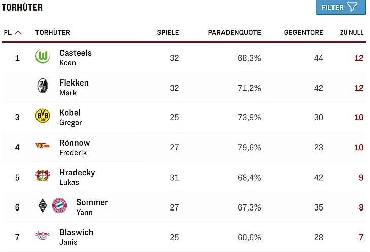 *игрок – кол-во игр – % отраженных ударов – пропущено мячей – матчи на ноль