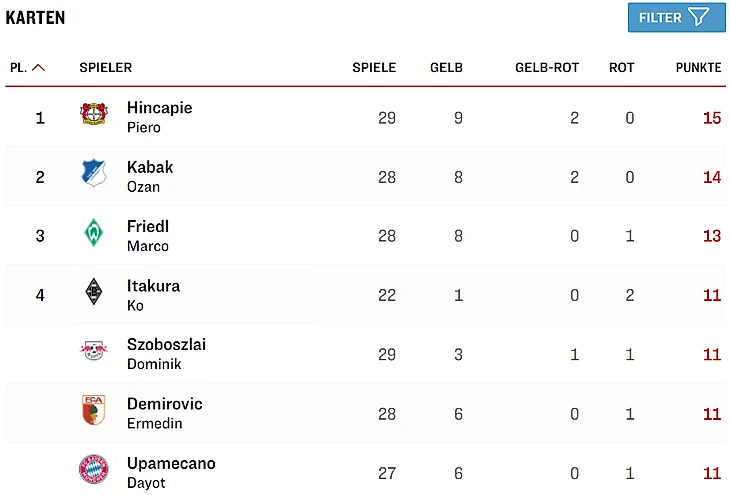 *игрок – кол-во игр – желтые – 1+1 желтые – красные – всего