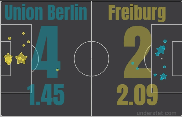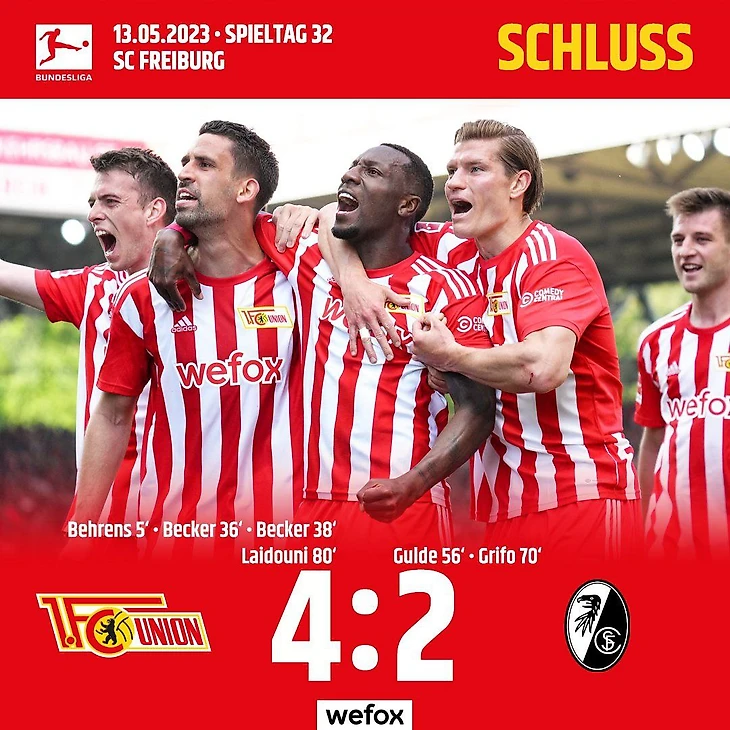«Унион» сделал важный шаг в направлении Лиги чемпионов. Поспособствовала этому победа в ключевом матче концовки сезона над «Фрайбургом». Победа уверенная и, что называется, за явным преимуществом. Пожалуй, многое было решено ещё в первом тайме. Здесь берлинцы и успешно нейтрализовали атаку соперника (всего два удара в исполнении «Фрайбурга» за половину), и трижды забили сами. Причем первый результативный удар, который знатно деморализовал «бразильцев из Брайсгау», хозяева нанесли ещё на 5-й минуте. Это Кевин Беренс, не забивавший дома чуть более месяца, получил мяч по центру штрафной и отправил его в ворота — 1:0. Дальше — больше. Незадолго до перерыва «Унион» провёл еще две результативные атаки всего за две минуты. В обоих случаях пригодились умения защитника Робина Кнохе — размашистыми передачами он то и дело выводил на ударную позицию Шералдо Беккера. Суринамец оформил дубль — 3:0. Но даже такое преимущество берлинская команда едва не упустила. «Фрайбургу» помогли стандарты. Подача с углового в исполнении Винченцо Грифо и его же точный одиннадцатиметровый — и это уже совсем другая игра при счете 3:2. Во втором тайме гости нанесли 5 ударов в створ, но сейвы Роннова позволили «Униону» сохранить минимальный перевес. А закрыл вопрос о победителе вышедший на замену Лайдуни. Точным ударом он завершил контратаку, в которую убежал вместе со все тем же Беккером — 4:2. Шералдо в итоге выдал уникальный матч — два гола и два ассиста. А сам «Унион», перед матчем имевший равенство с «Фрайбургом» по очкам (56 на 56), получил на финише сезона очень важный перевес в 3 балла.