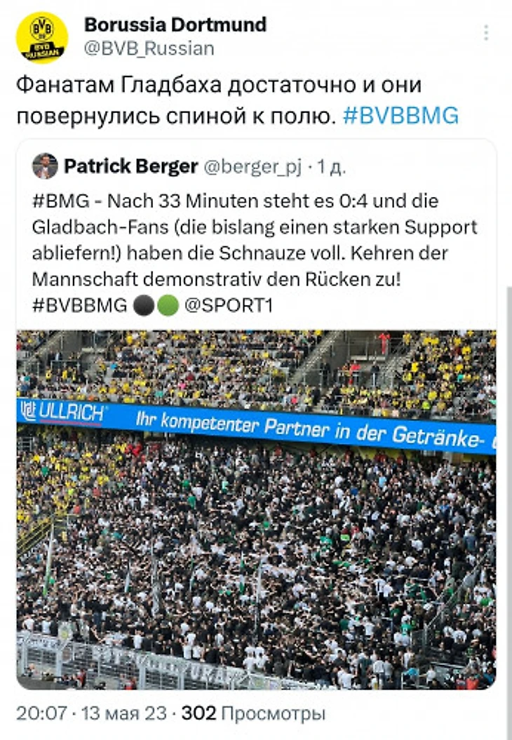 Первый тайм был феерией Дортмунда, который выиграл его со счетом 4:0 и заставил болельщиков Гладбаха повернуться спиной к своей команде.