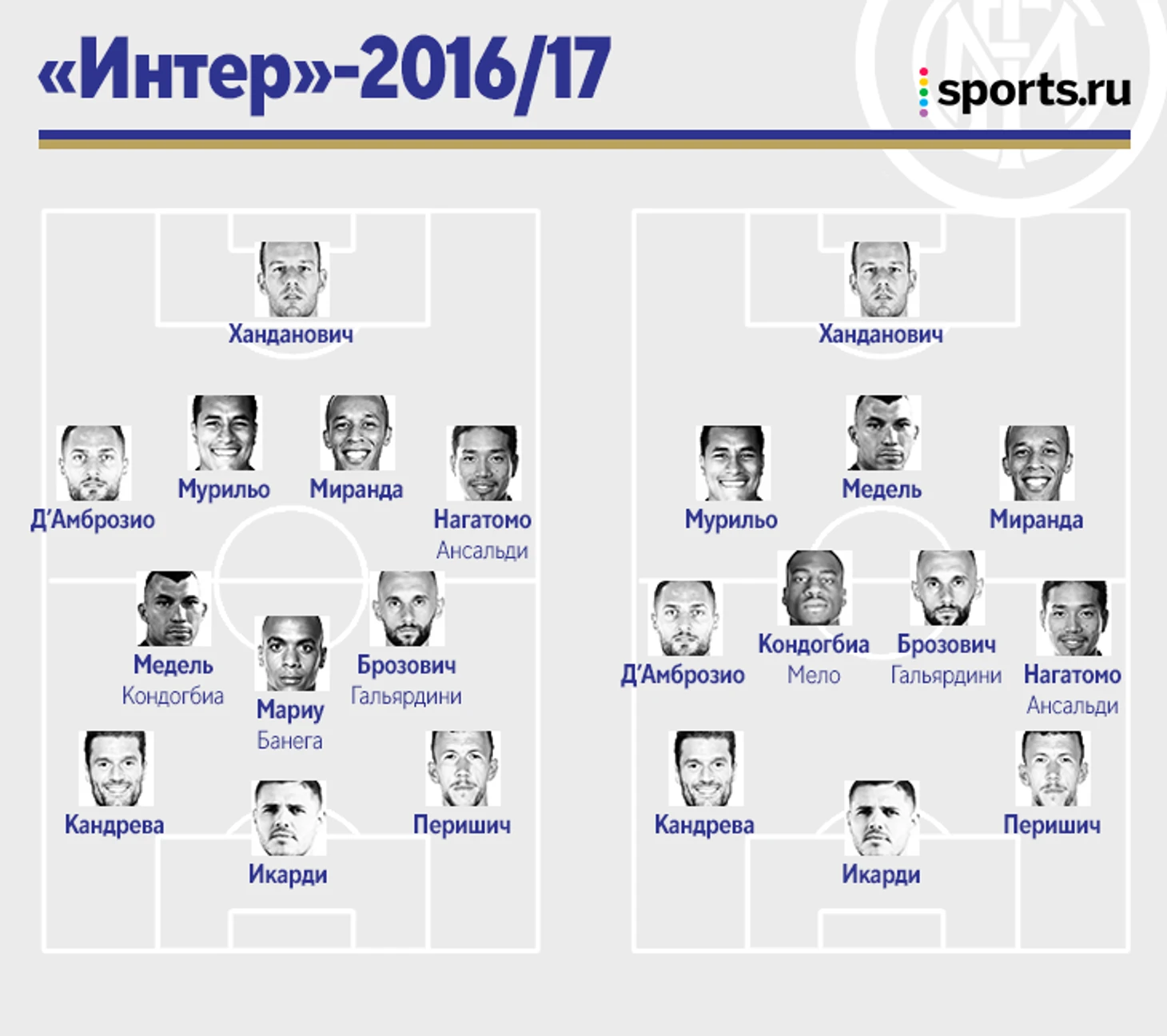 Пиоли же казался тактически гибким: он гармонично перекатывался из 4-2-3-1 в 4-3-3, а иногда даже в 3-4-3, часто подстраивался под соперников. Состав позволял: в центре обороны были Миранда (ага, тот самый из «Атлетико» Симеоне), Мурильо и Гари Медель с хорошим пасом. В центре Брозович и Кондогбиа, латералей исполняли Данило Д’Амброзио, Кристиан Ансальди, Юто Нагатомо и даже Давиде Сантон. Под нападающим менялись Эвер Банега и Жоау Мариу, на флангах почти безальтернативные Антонио Кандрева и Иван Перишич, впереди бессменный Икарди.