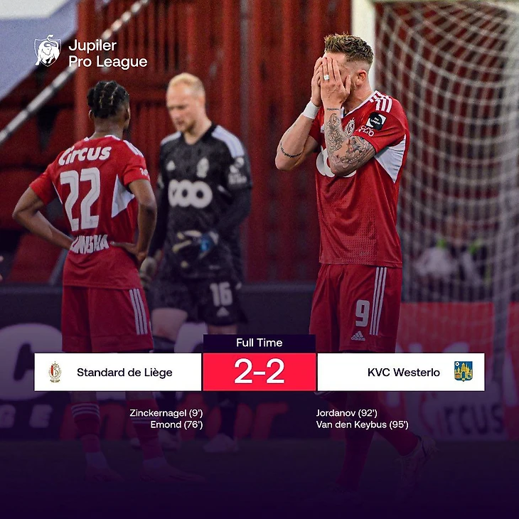«Вестерло» бросился в атаку. Де Кейпер и ван ден Кейбус с разницей в десять минут попали в штангу. Это были сигналы тревоги перед добавленным временем, где гости отыгрались. Героем концовки стал защитник «Вестерло» Йорданов: на 92-й забил, а на 95-й ассистировал (ВДК, которого я считаю лучшим игроком матча, все-таки не ушел с поля без гола).