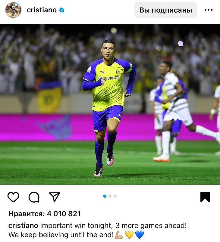«Важная победа сегодня, впереди еще 3 игры! Мы продолжаем верить до конца!💪🏼 💛💙» – написал Роналду.