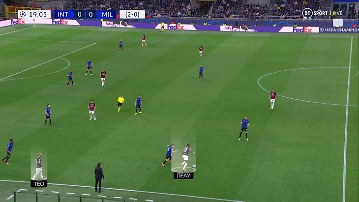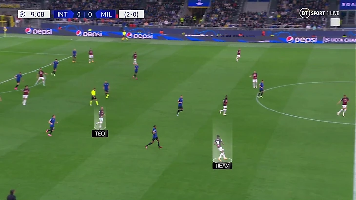 Слева у «Милана» тоже была задумка, как запутать «Интер». Но еще менее эффективная. Леау регулярно спускался глубже Тео:
