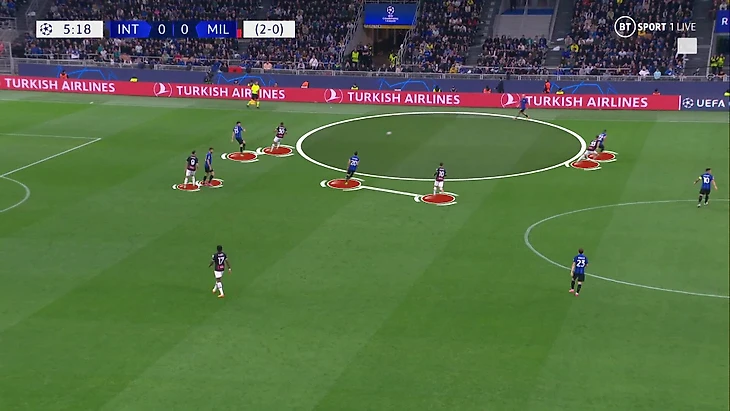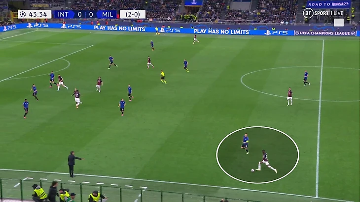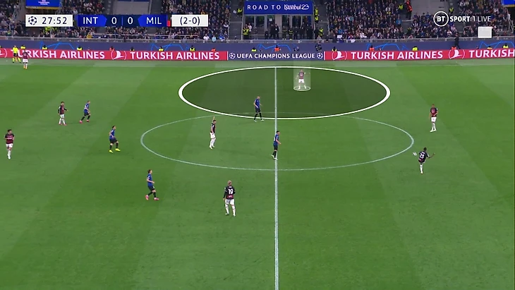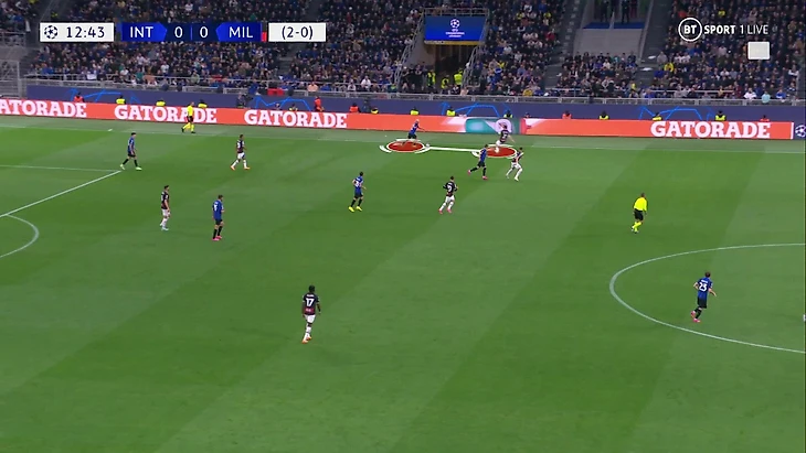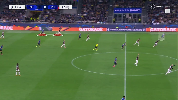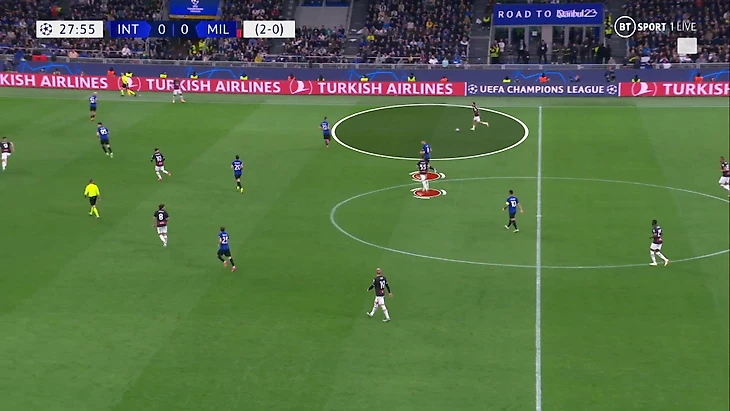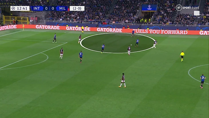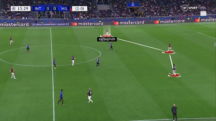 Это подчеркивало, что у «Милана» нет четкого алгоритма действий. Калабрия решал по эпизоду. «Интер», напротив, действовал умышленно – был готов к любой реакции. Прикрыть эту зону другим игроком не получалось, так как у прессинга «Милана» были персональные ориентировки. Это просто сместило бы дыру в другое место.