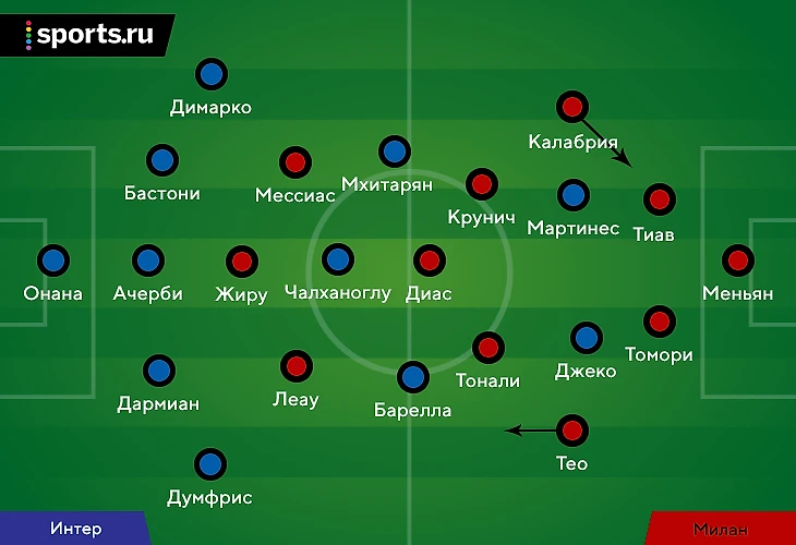 Симоне Индзаги продублировал состав из первого матча. Пиоли из-за травмы потерял Исмаэля Беннасера, зато вернулся Рафаэл Леау. Именно с этим связаны изменения в атаке. Леау стартовал на любимой позиции слева, Браим Диас – под нападающим, а Жуниор Мессиас – справа: