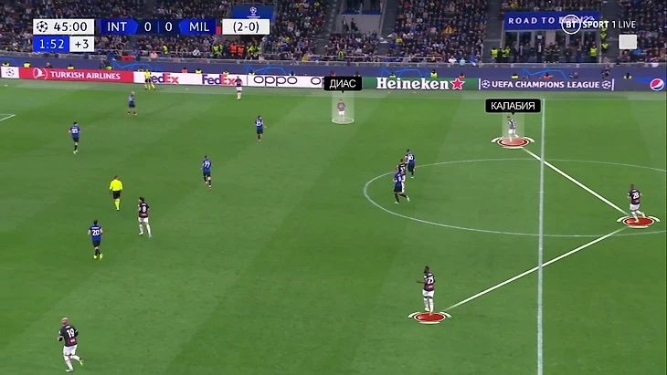 Еще один важный элемент – под Калабрию на правом фланге регулярно открывался Диас, тем самым предлагая легкий вариант для продолжения: